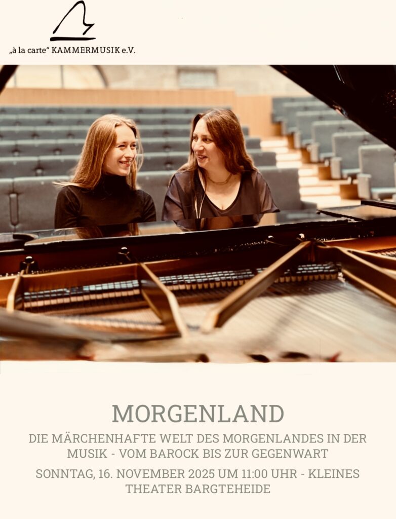 Das Programm ist der märchenhaften Welt des Orients gewidmet. Die beiden Pianistinnen präsentieren eine stimmungsvolle Reise mit faszinierender Klaviermusik für vier Hände, inspiriert durch 1001 Nacht, biblischen Geschichten, jüdischen Gebeten und türkischen Märchen, komponiert von großen Komponisten wie Mozart, Rameau, Alkan, Debussy bis Fazil Say und anderen.