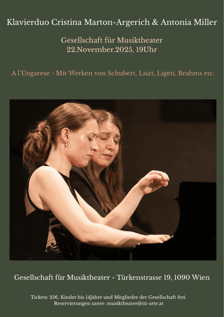 Ihr vierhändiges Programm ” A l´ungarese” ist voller Kontraste, Humor, Virtuosität und Poesie. Es umfasst Werke mit ungarischem Hintergrund von Franz Schubert, György Ligeti, György Kurtag, Bela Bartok, Ernö Dohnányi, Franz Liszt und Johannes Brahms.